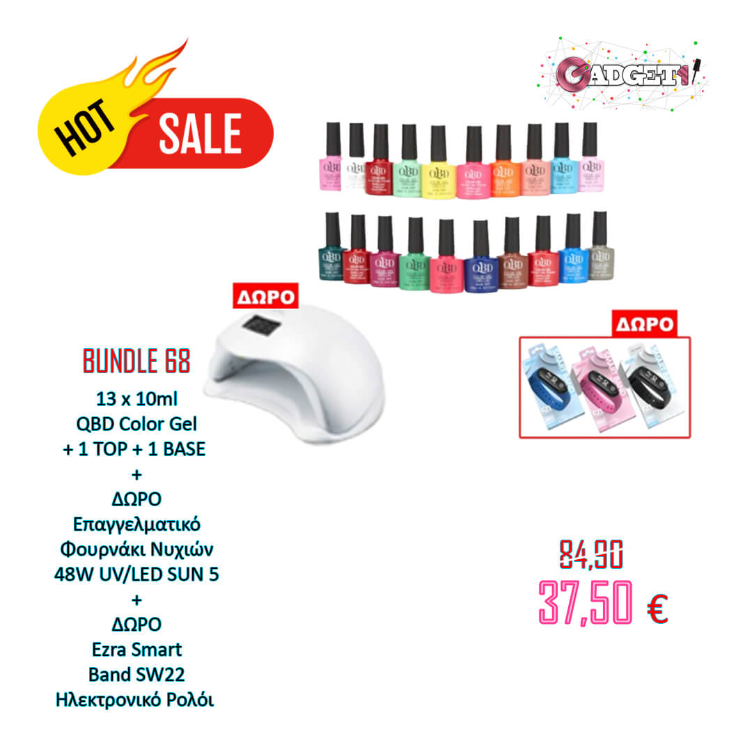 Bundle 68 | 13 Ημίμονιμα Βερνίκια Νυχιών 10ml + 1 TOP Coat + 1 BASE Coat + Δώρο Επαγγελματικό Φουρνάκι Νυχιών SUN 5 & ΔΩΡΟ Ηλεκτρονικό Ρολόι – EZRA