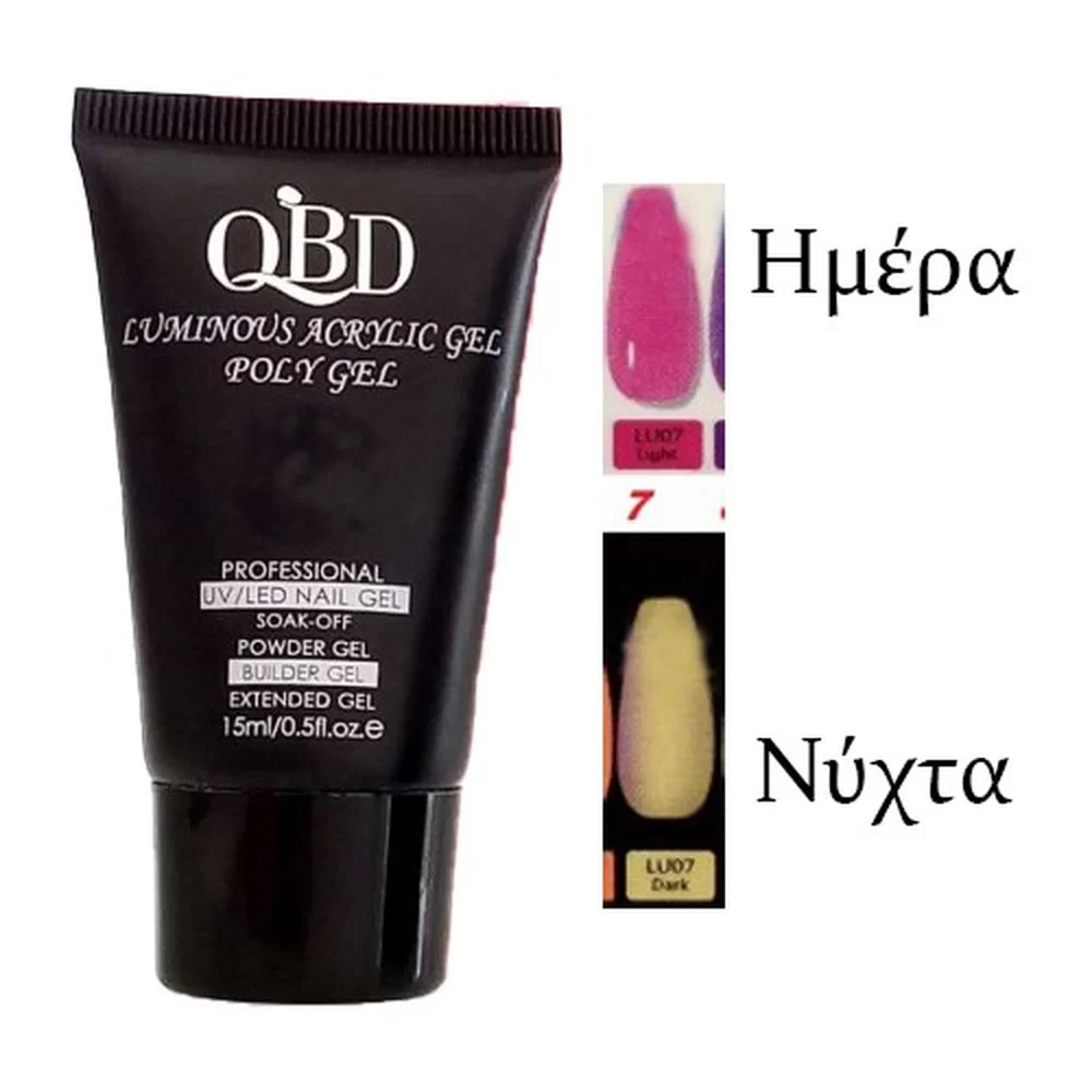 QBD LUMINOUS Acrylic Gel Polygel 15ml N-7Professional nail gel SOAK-OFFPowder GelBuilder GelExtended GelΝέο Polygel που αλλάζει χρώμα στο σκοτάδι.Καταπληκτικά Χρώματα που φωσφορίζουν.Μπορείτε να τα εφαρμόσετε πάνω στο νύχι σας σαν ενίσχυση ή με doual form ή φόρμες αυτοκόλλητες, για χτίσιμο ( επέκταση ).